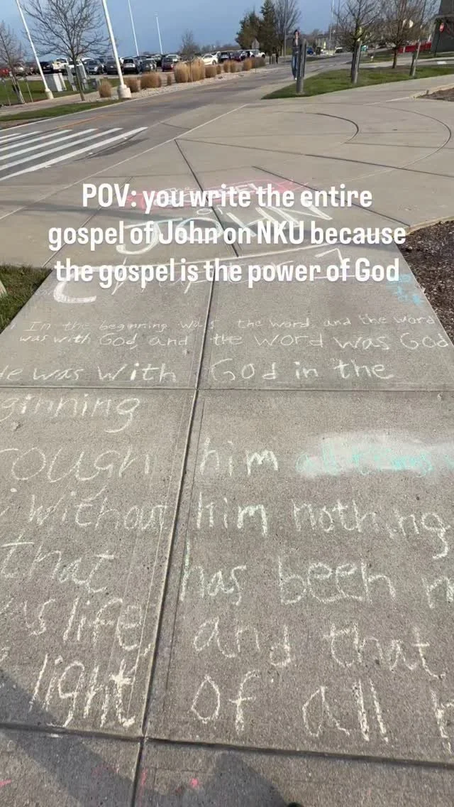 The gospel is the power of God! A group of students at northern Kentucky university wrote the entire gospel of John in sidewalk chalk on their campus! God is moving as people interact with His word.